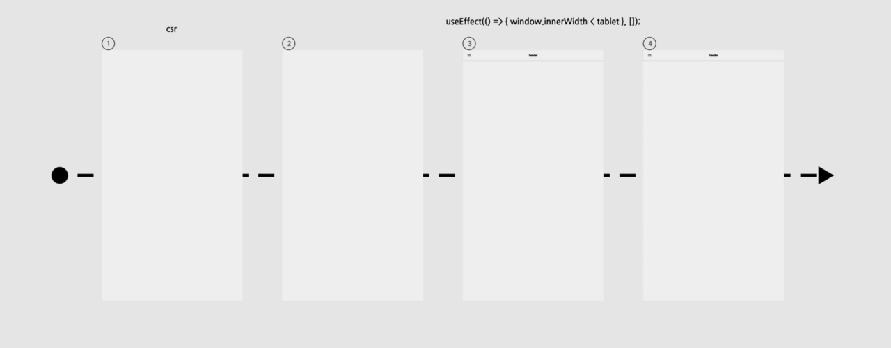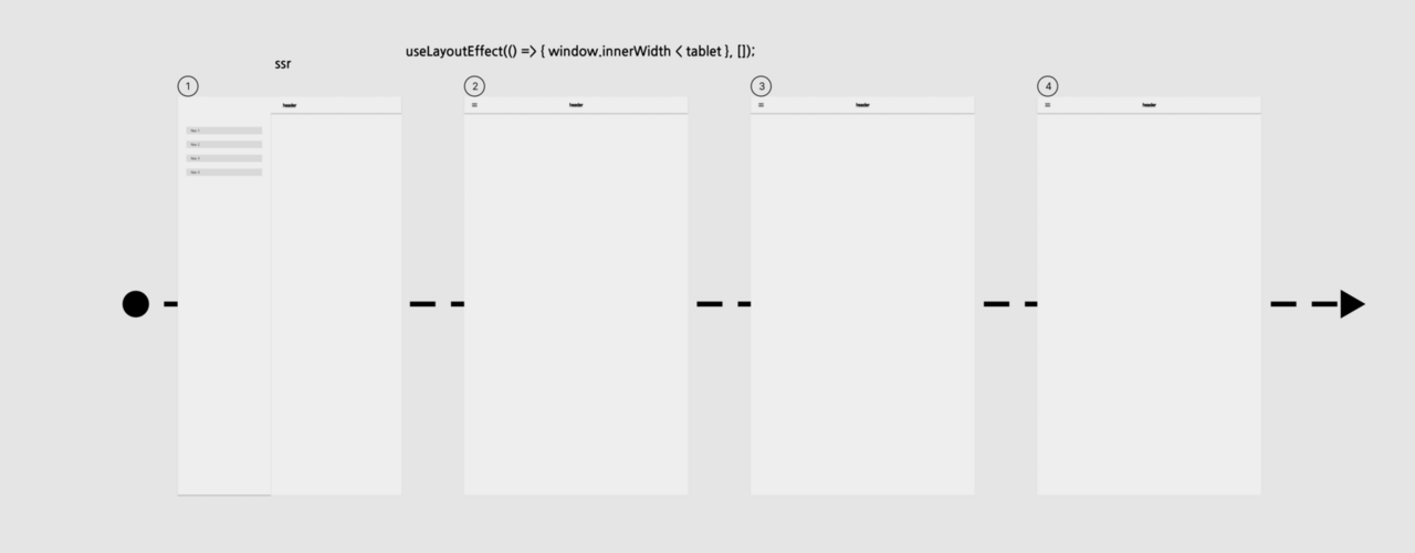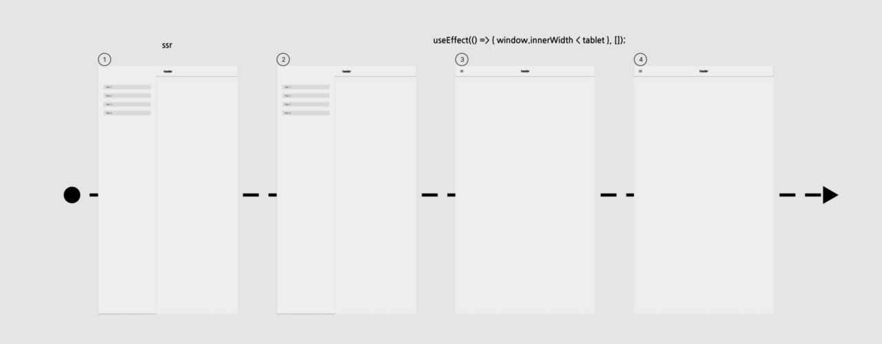 useWindow를 사용하였을 경우 브라우저 화면을 늘리고 줄일 때마다 UI가 즉시 반영된다. 하지만 이는 모든 초기 렌더링이 끝났을 경우의 이야기이고, 아래의 각 서비스 환경에 따라 초기 렌더링 시의 보이는 화면에 대한 차이를 이야기해보려고 한다.