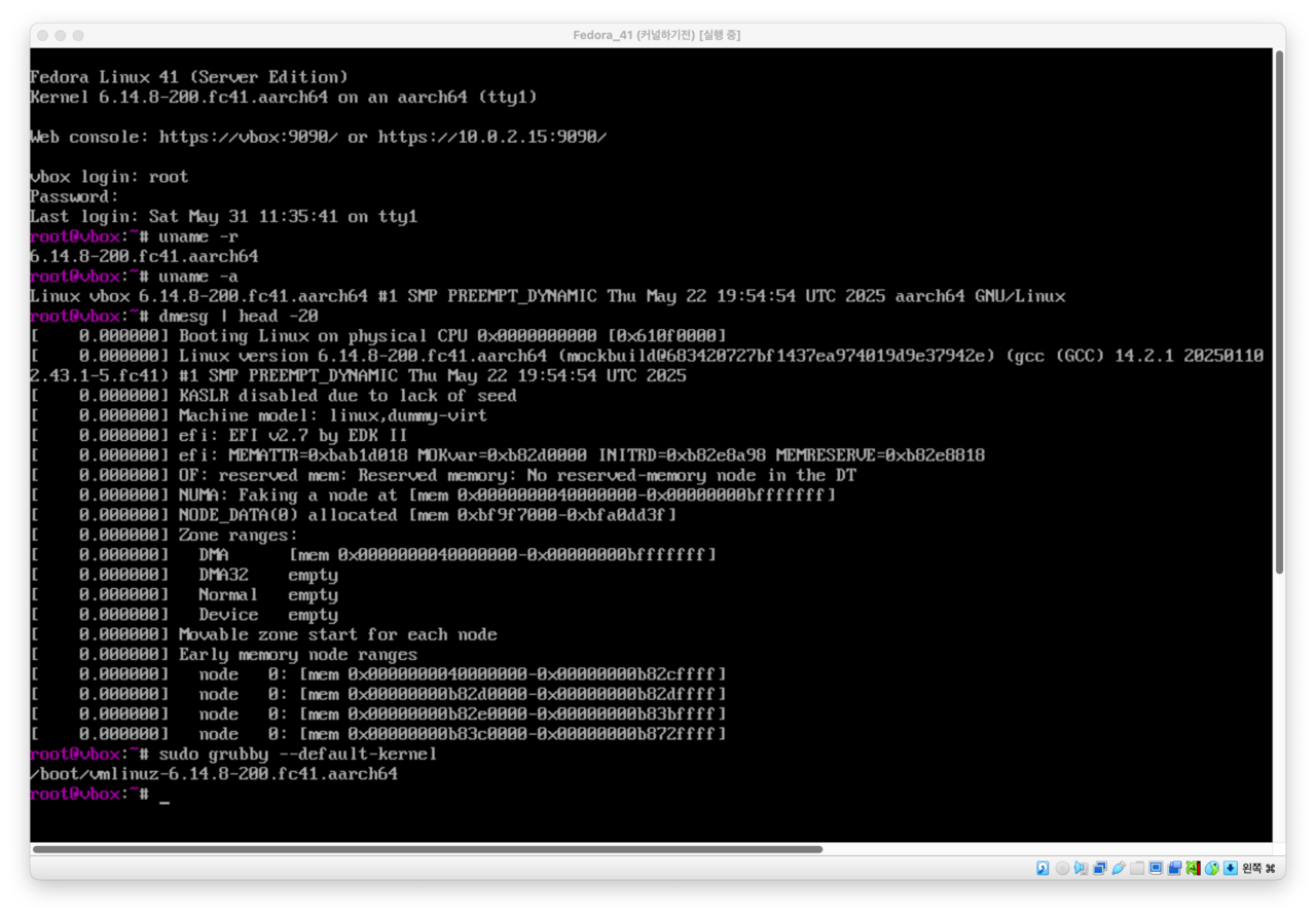 uname,rpm,dnf등의 명령어를 통해 시스템 상태를 진단하는 방법을 익혔습니다. - 부트로더 관리: GRUB와 grubby를 활용한 부팅 설정 관리 방법을 학습했습니다.